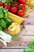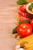 makaron z oliwek, sera i warzyw na drewniany stół szczegół