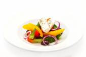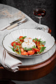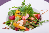 sałatka owocowa z truskawkami, plasterkami sera pomarańczowego i rukoli
