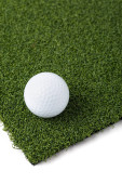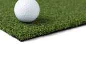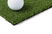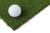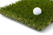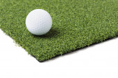 Golf Ball spoczywa na odcinku sztucznej trawy trawy na białym tle