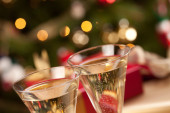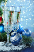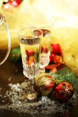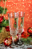 Kompozycja z ozdób choinkowych i dwa kieliszki do szampana, na jasnym tle