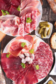 różne rodzaje mięsa, delikatesy z salami, kiełbasa, bekon, szynka