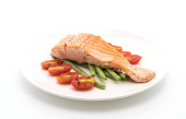 Grillowany stek łososiowy z pomidorami na gałęzi. Na niebieskim talerzu i drewnianej desce