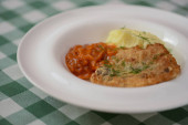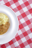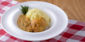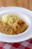 Tradycyjna kuchnia, tłuczone ziemniaki z sosem, mięso i koperek podawane na białym talerzu na tle kraty