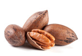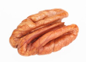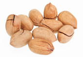 kilka orzechów pekan na białym tle biały, jeden pęknięty