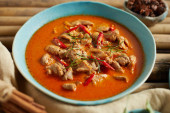 Zdjęcie "Suszona czerwona wieprzowina curry kokosowe, tajska cuisin" może być wykorzystywane do celów osobistych i komercyjnych zgodnie z warunkami zakupionej licencji Royalty-free. Obraz jest dostępny do pobrania w jakości wysokiej rozdzielczości do 5760x3840.