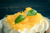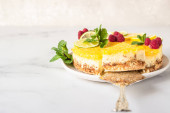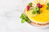 Cytrynowy mus waniliowy sernik z twarogiem cytrynowym ozdobiony plastrami cytryny i limonki, mrożoną maliną i miętą na ceramicznym talerzu. Jasnoszare tło.