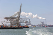 Aichi, Japonia-14 stycznia 2020: Barka lub zapalniczka holowana przez holowniki w porcie Nagoya w Ise Bay, Japonia