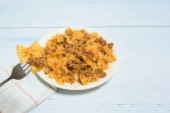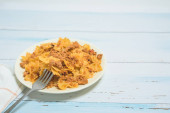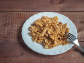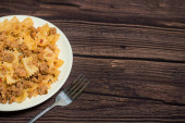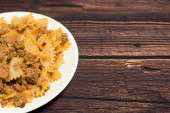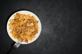 makaron z mięsem na ciemnym tle. na widelcu makaron w kształcie motyla z mięsem. widok z góry. miejsce na tekst. Zdjęcie na baner