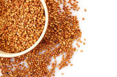 zdrowa gryka w misce izolowanej na szarym tle zbliżenie z miejscem na tekst