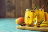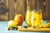 Cydr gruszkowy lub przyprawiona herbata lub grog z cytryną, gruszką, cynamonem, anyżem, kardamonem, rozmarynem. Uroczyste letnie drinki, koktajl z gruszek. Gorący koktajl napojowy na Nowy Rok, Boże Narodzenie, zimę lub jesień