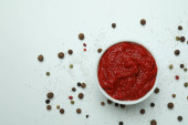 Zdjęcie "Sos chili teksturowane tło, widok z góry, zbliżenie. Miejsce na te" może być wykorzystywane do celów osobistych i komercyjnych zgodnie z warunkami zakupionej licencji Royalty-free. Obraz jest dostępny do pobrania w jakości wysokiej rozdzielczości do 5760x3840.