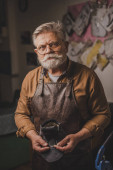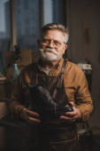 selektywne skupienie się na seniorskim szewcu trzymającym kawałek prawdziwej skóry w warsztacie