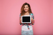 wesoły bi-rasowy dziewczyna pokazując cyfrowy tablet z pusty ekran na żółtym tle
