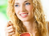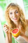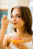 uśmiechnięta kobieta, spożywanie grejpfrutów w domu