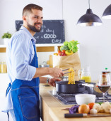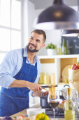 Uśmiechnięta młoda para gotuje jedzenie w kuchni