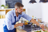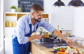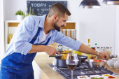 Zdjęcie "Uśmiechnięta młoda para gotuje jedzenie w kuchni" może być wykorzystywane do celów osobistych i komercyjnych zgodnie z warunkami zakupionej licencji Royalty-free. Obraz jest dostępny do pobrania w jakości wysokiej rozdzielczości do 5760x3840.