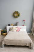 Łóżko w sypialni w skandynawskim minimalistycznym stylu. Pigułka szara