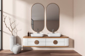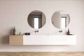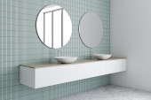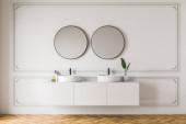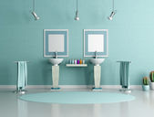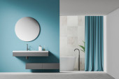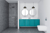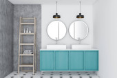 Zdjęcie "Niebiesko-białe wnętrze łazienki, podwójny zlew" może być wykorzystywane do celów osobistych i komercyjnych zgodnie z warunkami zakupionej licencji Royalty-free. Obraz jest dostępny do pobrania w jakości wysokiej rozdzielczości do 5760x3840.