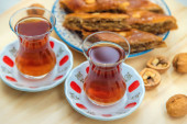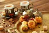Tradycyjny arabski deser baklava z nerkowca, orzechy włoskie, rodzynki na talerzu