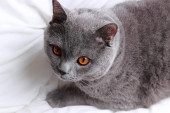 Szary kot poluje na pomarańczową tkaninę. Kocia twarz z bliska. Szary kot dowcip