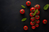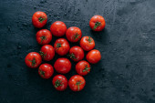 Widok z góry świeżych czerwonych pomidorów mokrych po deszczu. Skopiuj przestrzeń na bok. Ekologiczne warzywa. Surowe jedzenie. Koncepcja zdrowego odżywiania. Dojrzałe soczyste pomidory Heirloom