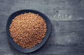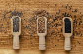 siemię lniane, nasiona lnu, drewniana miarka, worek workowy na drewnianym tle