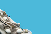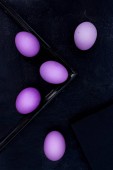 Kreatywna kartka wielkanocna z niebieskimi złotymi jajkami na niebieskim ciemnym tle z przestrzenią do kopiowania