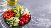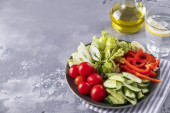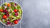 Zdjęcie "Świeża mieszanka sałatek z warzywami na talerzu. Widok góry. Zbliżenie. Koncepcja diety" może być wykorzystywane do celów osobistych i komercyjnych zgodnie z warunkami zakupionej licencji Royalty-free. Obraz jest dostępny do pobrania w jakości wysokiej rozdzielczości do 5760x3840.