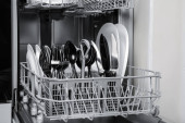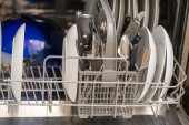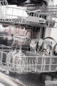 Zdjęcie "Dolna półka kosza na zmywarkę jest pchana do przodu w sanitariacie wypełnionym czystymi naczyniami musującymi.." może być wykorzystywane do celów osobistych i komercyjnych zgodnie z warunkami zakupionej licencji Royalty-free. Obraz jest dostępny do pobrania w jakości wysokiej rozdzielczości do 5760x3840.