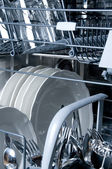 Dolna półka kosza na zmywarkę jest pchana do przodu w sanitariacie wypełnionym czystymi naczyniami musującymi..