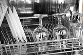 Czyste naczynia błyszczą i błyszczą na górnej półce zmywarki, widok pod kątem.