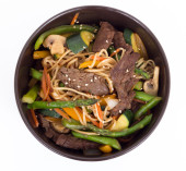 pyszne azjatyckie jedzenie, lo mein z mięsem, warzywami, pałeczki z makaronem