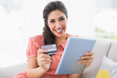 Szczęśliwa młoda kobieta za pomocą jej tabletki na zakupy online