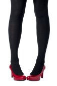 rajstopy nogi kobieta z czerwonymi obcasami nad białym