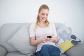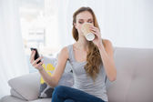 młoda kobieta siedzi na kanapie, trzymając kubek jednorazowy SMS-y na telefon