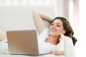 zrelaksowany brunetka dorywczo w żółty sweter patrząc na tablet pc