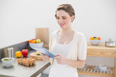 uśmiechnięta młoda kobieta za pomocą jej cyfrowy tablicowy