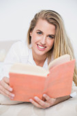 uśmiechający się wzór świeży czytanie książki siedzi na kanapie