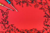 śrubokręty i krawędź śrub na białym tle z przestrzenią do kopiowania, płaskie układanie