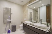Zdjęcie "Wnętrze luksusowej łazienki hotelowej ze szklaną kabiną prysznicową" może być wykorzystywane do celów osobistych i komercyjnych zgodnie z warunkami zakupionej licencji Royalty-free. Obraz jest dostępny do pobrania w jakości wysokiej rozdzielczości do 5760x3840.