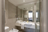 Wnętrze luksusowej łazienki hotelowej ze szklaną kabiną prysznicową