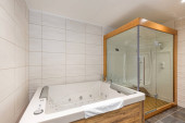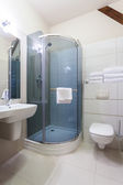 Wnętrze luksusowej łazienki hotelowej ze szklaną kabiną prysznicową