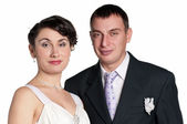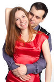 przystojny para. człowieku ogarni kobieta w czerwonej sukience.