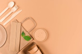 Ekologiczne sztućce papierowe. Koncepcja zero odpadów. Plastikowa koncepcja. Widok z góry, płaski, przestrzeń do kopiowania.