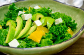 Pyszna sałatka jarmużowa w drewnianej misce, zbliżenie