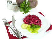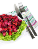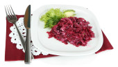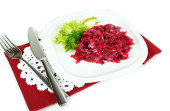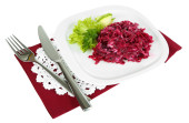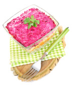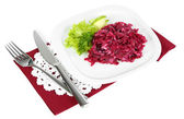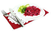 Sałatka z buraków na tabliczce na serwetki na białym tle