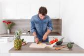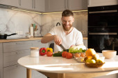 Uśmiechnięty człowiek krojący pomidory wiśniowe do sałatki