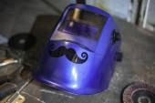 Maska dla ochrony przed jasnym spawaniem. Wąsy przyklejone do maski. Do naklejki na wąsy użyto folii samoprzylepnej. Praca w warsztacie. Mąż kocha pracę fizyczną..