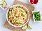 Smażony tajski kurczak z bazylii podawany z cytryną i liśćmi bazylii Top View Photo.