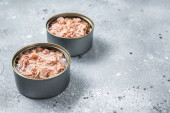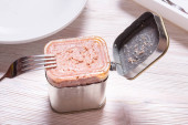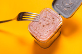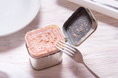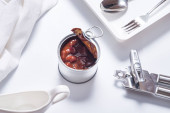 Otwarta puszka z wołowiną w puszce, górny widok stół kuchenny